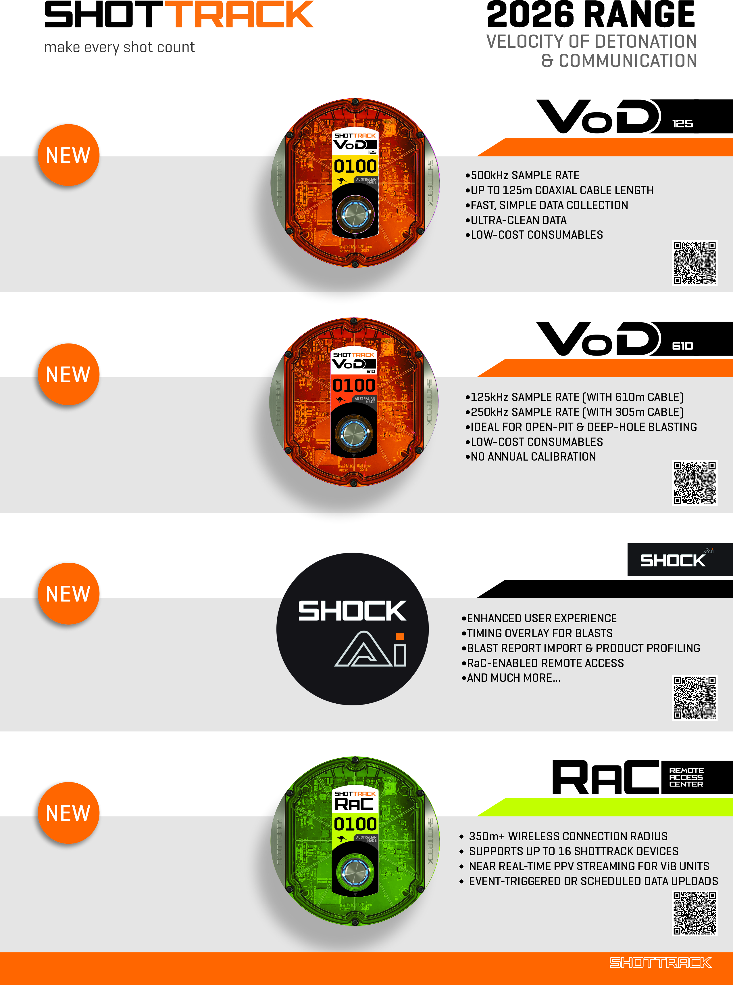 ShotTrack Pty Ltd is an Australian technology company specialising in advanced blast monitoring systems for the mining, construction, and tunnelling sectors. We design and manufacture high-resolution vibration and Velocity of Detonation (VoD) instruments that are fully digital, time-synchronised, and capable of remote autonomous data uploads. Our ViB and VoD monitoring units deliver superior accuracy through accelerometer-based sensing and TDR technology, overcoming the limitations of traditional geophone and resistive wire systems. All ShotTrack devices connect to ShockAi, our cloud-based analytics platform, enabling real-time reporting, AI-driven predictive modelling, international compliance monitoring, and machine learning tools for optimising blasting performance, safety, and environmental outcomes. With customers across 20+ countries, ShotTrack provides scalable, cost-effective solutions that improve productivity and reduce operational risk.